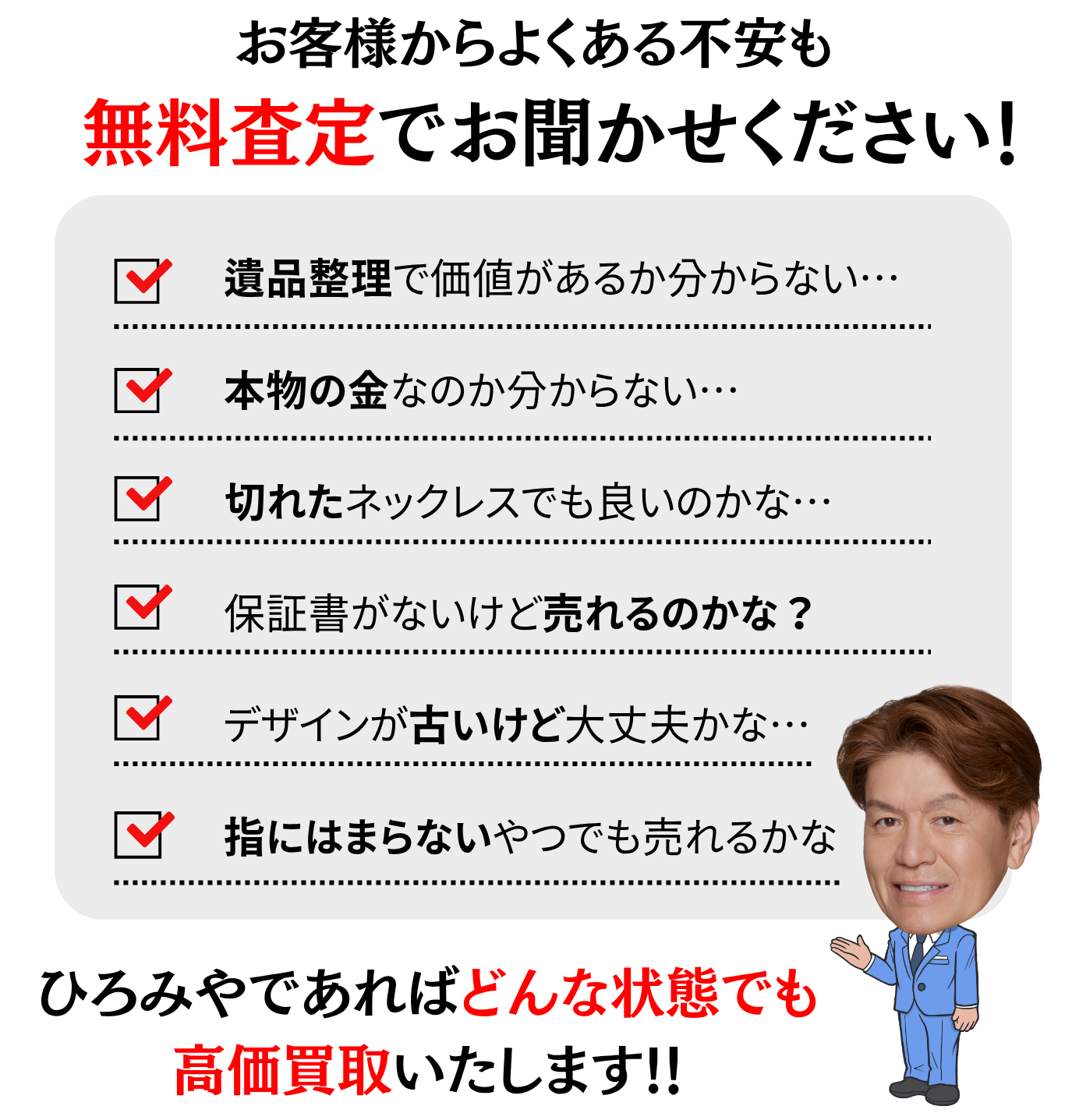 使わなくなったネックレスや指輪を整理しようと思い、相談しました。 自宅まで来ていただき、査定もスムーズで納得の価格で買い取ってもらえました! 古いデザインのものでもしっかり評価してもらえたのが嬉しかったです。